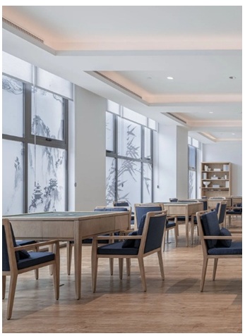 餐廳是本案中至關重要的功能區之一,設計上細分為自助餐廳、零點餐廳、西餐廳等不同場域,可同時容納300余人,滿足老人不同的用餐需求與體驗。同時,在用餐時間之外,面積廣闊、座次充足的餐廳,將作為多功能室存在,讓人們擁有更充裕的空間開展社交、興趣活動,實現尺寸適老化、功能適老化、情感適老化。