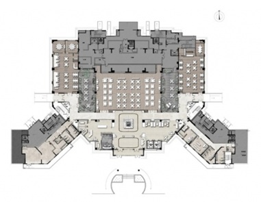 本案在設計上依循適老性、舒適性原則,關懷不同老人的身體機能以及行為需求:走廊上不間斷的扶手,供步行不便的人們行動時抓、扶與支撐,同時扶手所對應的燈光設置,巧妙而溫和地照亮一隅;長廊上特別設置的休息座區,細心照顧步行得疲累的人們,圓融弧度的布藝沙發、木藝座椅、大理石案幾,優化安全性,同時深色調布藝椅墊亦有防污、易清潔的效果;充足的開敞空間與綠化,引入自然景觀,讓人視覺上感受與四季、樹木、花草的聯結,予人清新、有活力的心境體驗。