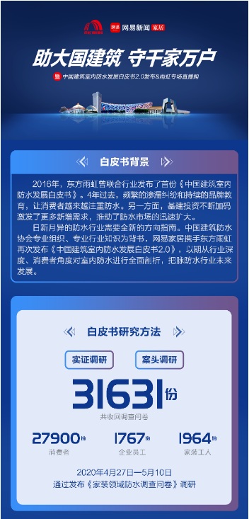 此次白皮書的發布基于最新的行業數據,以及今年東方雨虹聯合網易家居在線上開展的“家裝領域防水調查”。千呼萬喚始出來,白皮書2.0不再半遮面,而是以最開放的態度呼吁全行業對于防水的關注。