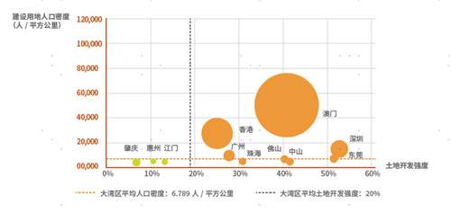 ▲2018年粵港澳大灣區城市土地開發強度、人口密度和單位產值(圖源:《華潤置地城市更新白皮書》)