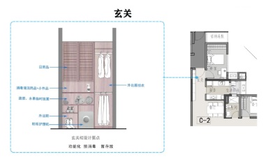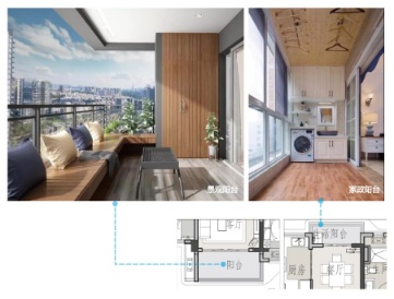 全戶型南北雙陽臺設計——景觀陽臺放松身心,家政陽臺收納生活。家政陽臺設置次凈衣模塊與消毒模塊。舉個例子,下班買菜回家直接放回冰箱,需要換掉的外套也可以放去家政陽臺,讓“次凈”的衣服不進入客廳,當需要清洗時只需一步就能將臟衣服拿去洗衣機。