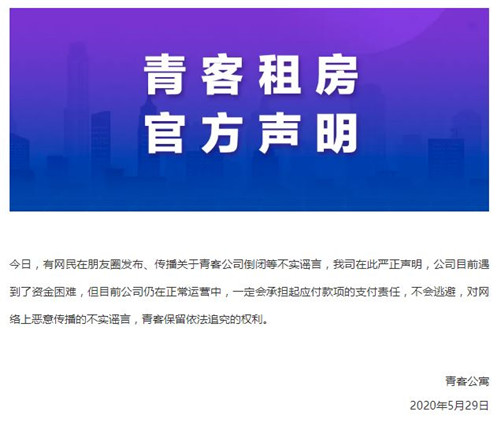 近日,一則關(guān)于“青客公寓倒閉、售后安排退款”的消息在朋友圈廣為傳播。青客公寓官方微信號(hào)“青客租房”對(duì)此發(fā)布聲明稱,“今日,有網(wǎng)民在朋友圈發(fā)布、傳播關(guān)于青客公司倒閉等不實(shí)謠言,我司在此嚴(yán)正聲明,公司目前遇到了資金困難,但目前公司仍在正常運(yùn)營(yíng)中,一定會(huì)承擔(dān)起應(yīng)付款項(xiàng)的支付責(zé)任,不會(huì)逃避,對(duì)網(wǎng)絡(luò)上惡意傳播的不實(shí)謠言,青客保留依法追究的權(quán)利。”