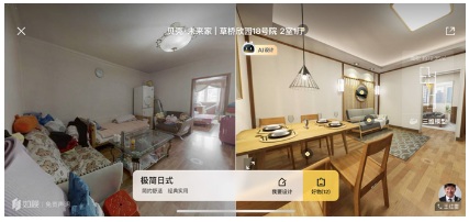 用戶在貝殼找房平臺上瀏覽二手房源時,僅需點擊房源詳情頁或VR頁面里的的“設計效果”,即可獲得由AI生成的全屋設計解決方案。它包含平面方案、硬裝軟裝搭配方案、三維效果,讓用戶可以游走在“裝修”后的客廳、餐廳、臥室各功能區,移步換景,查看每一處細節。同時,貝殼未來家還能隨時與裝修前的屋內真實場景進行同屏對比,直觀了解如何對現有空間進行改造。