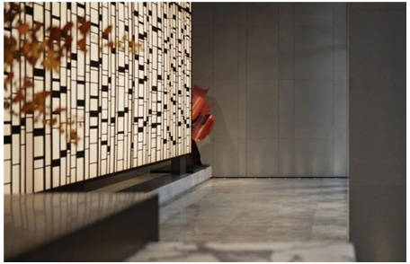 前廳圍合,設屏風,引入神秘的步入式體驗。奇山花城背景,茶香石榴元素的透光屏風,情境營造出朦朧如到臨雨后的錦城。