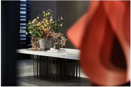 沙盤區(qū)運用抽象線條打破物象意義的羈絆,以簡潔、干凈回應現(xiàn)代人的理性、克制。深樸悅設計借藤蔓花枝的生動真實,重現(xiàn)錦官城的樸實、繁華。來自英國的雕塑作品Nick Moran現(xiàn)代而充滿力量,呈現(xiàn)的秩序美,宛如成都固有的繁花霖霖與綻放盛貌。