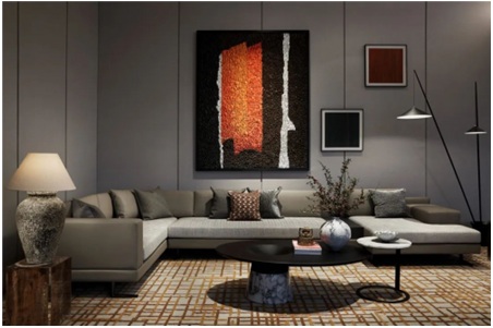 售樓空間中,藝術(shù)品承擔了空間故事的講述者,營造了多處不同感受。擺臺上抽象意念的蜀錦與古件,如臨錦城,抿一抹絲綢之路所想。
