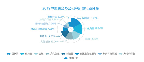從入駐租戶的行業分布來看,2019年租戶集中較多的前三個行業分別為互聯網行業、教育行業、金融行業,占比分別為16.2%、15.9%、14.1%。