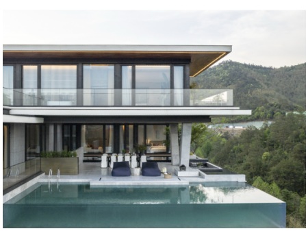 圍坐在戶外混凝土下沉式圍爐區,嵌入自然中去,傾聽耳畔的流水,感受躍動的火光。建筑和室內的關系、局部和整體之間、人與自然交融無間。透明懸空的泳池,似一個晶瑩的藍水晶漂浮在山間,黑夜池底部閃耀點狀燈光,有如水中繁星,遙應星際宇宙的廣博。