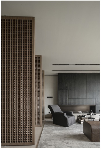 設計中一層主客廳的開闊的結構,讓空間溶解于天地自然之中,其間穿插木格柵為空間梳理視線。