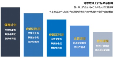 博志成地產(chǎn)學(xué)堂課經(jīng)過不斷完善升級,已經(jīng)逐步形成了領(lǐng)跑計劃、專項訓(xùn)練營、專題系列課、主題課程及合作課程五大線上產(chǎn)品體系。