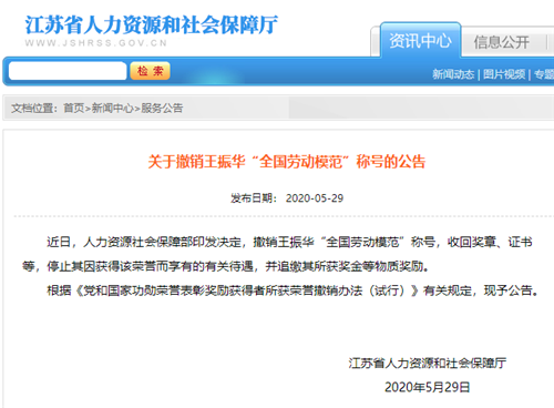 房訊網訊 近日,江蘇省人社廳網站發布《關于撤銷王振華“全國勞動模范”稱號的公告》,人力資源社會保障部印發決定,決定撤銷王振華“全國勞動模范”稱號。