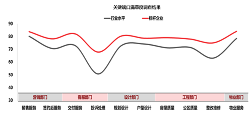值得一提的是,在本次抗疫中發揮了重大作用的物業滿意度也在提升!秷蟾妗凤@示,營銷與物業是滿意度水平相對較高的兩個職能部門,其中銷售服務與物業服務是行業水平及標桿企業中得分最高的兩個指標;客服端標桿企業優勢最為明顯,其中交付服務領先9分左右;投訴處理領先優勢更是超過15分。