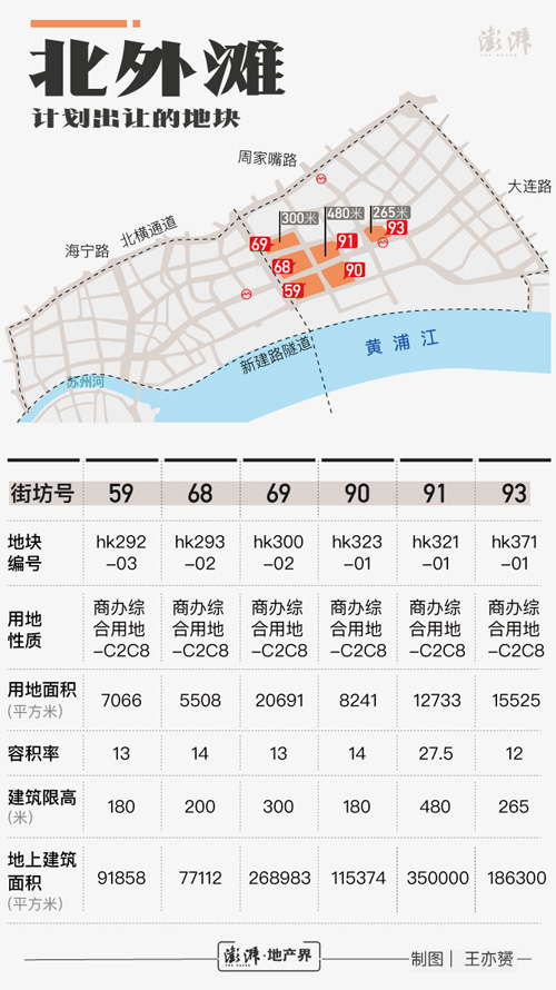 480米高樓所在的91街坊,占地面積1.2733萬(wàn)平方米,容積率達(dá)到27.5,地上建筑面積為35萬(wàn)平方米。69街坊地塊上計(jì)劃建造的300米高大樓,占地面積為2.0691萬(wàn)平方米,容積率為13,地上建筑面積約26.8983萬(wàn)平方米。緊鄰提籃橋地鐵站旁的93街坊地塊將會(huì)新建一棟265米高的大樓,用地面積約1.5525萬(wàn)平方米,地上建筑面積達(dá)到18.63萬(wàn)平方米。