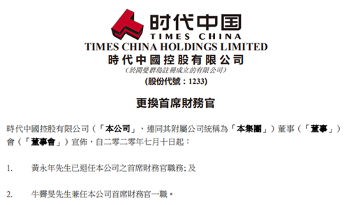 時代中國12日發(fā)布公告,更換首席財務官。公司指出,自2020年7月10日起,黃永年退任本公司之首席財務官職務,牛霽旻先生兼任本公司首席財務官一職。