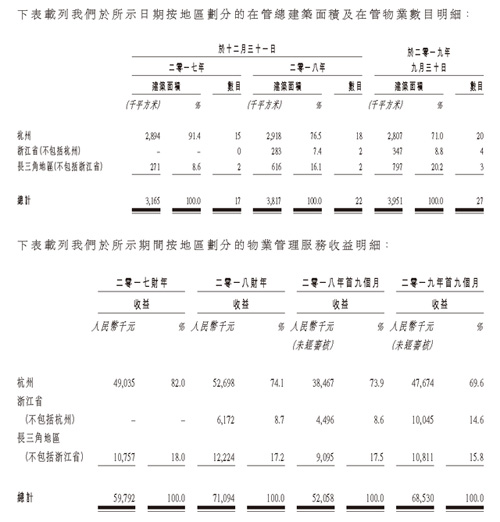 在2017年-2019年9月30日,宋都服務在杭州市的在管面積占比分別為91.4%、76.5%、71.0%,營收占比分別為82.0%、74.1%、69.6%。根據宋都服務招股說明書,其正逐步加大力度將服務范圍擴展到長三角地區的其他城市。