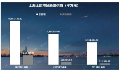 據辦辦網數據研究中心統計,2020年上半年上海土地市場新增經營性用地掛牌供應201宗,合計出讓面積10,555,420平方米。其中辦公用地為28宗,出讓面積總數為2,268,545平方米,占全部掛牌面積的21.49%,環比2019年下半年增長277.84%,同比2019年上半年增長627.25%。