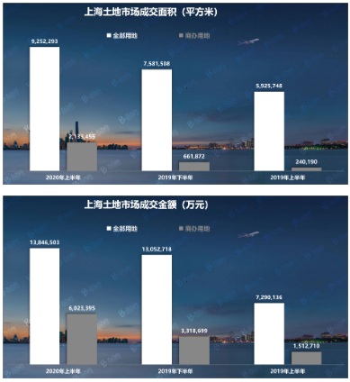 而在成交方面,據辦辦網數據研究中心統計,2020年上半年,上海土地市場共成交168宗土地,成交總面積為9,252,293平方米,環比去年下半年增長22.04%,同比去年上半年增長56.14%;成交總金額為13,846,503萬元,環比增長6.08%,同比增長89.93%。