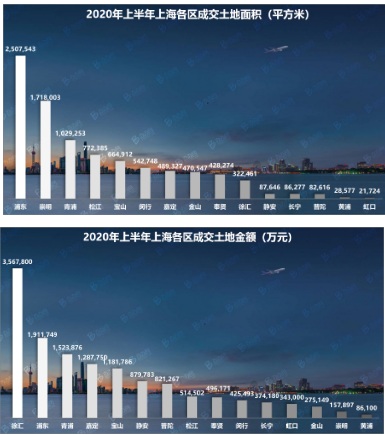 整個2020年上半年上海土地市場,共15個區域有用地成交,其中浦東新區42幅、青浦區23幅、松江區22幅、寶山區17幅、嘉定區14幅、奉賢區11幅、閔行區和金山區各10幅、普陀區6幅、崇明5幅、靜安區3幅、徐匯區2幅、長寧、虹口和黃浦各1幅。