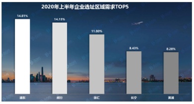 根據辦辦網數據統計,2020年上半年上海市辦公租賃市場中,浦東依然是企業辦公選址的首選區域,企業需求數量占整個需求市場的14.81%,占比幅度環比去年下半年略有下滑。排名前五的頭部區域中僅有閔行和黃浦的區域需求占比呈現增長,五大頭部區域的企業需求量占整個市場的57.48%。