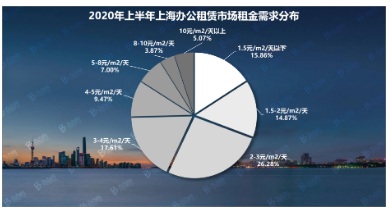 在2020年上半年的辦公租賃市場中,租金在3元/㎡·天以下的辦公項目成為最受關注的目標,需求占比達到57.01%,此租金段的占比需求相比2019年上半年略有下滑。浦東、閔行和徐匯是這個租金段最受關注的區域。而8元/㎡·天以上的高端租金需求相比2019年上半年則有一定幅度增長,需求占比達到8.94%,能承受高昂租金的客戶更青睞把尋址目標放在長寧、徐匯和浦東。