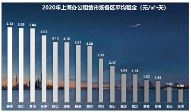 2020年上半年,在新冠疫情沖擊下,全市租金整體持續處于下行通道。縱觀各區,郊環地區的環比跌幅普遍高于中心城區。其中,靜安以5.12元/㎡·天的租金均價繼續成為上半年企業辦公空間成本最高的區域。