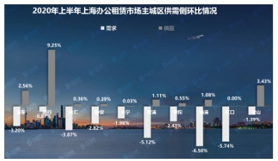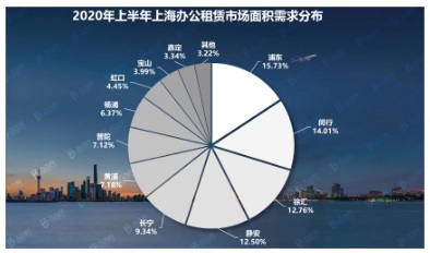 在區域分布方面,浦東、閔行、徐匯、靜安和長寧是上半年需求面積最多的區域,5個區合計需求辦公面積占整個市場的64.33%。