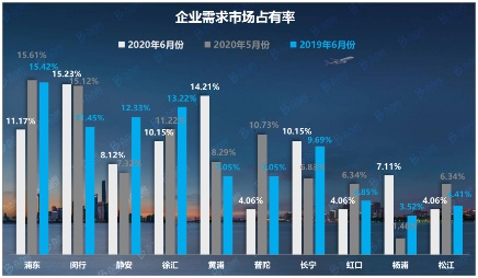 本次入榜的10個區域總共占據了整個上海辦公物業租賃市場88.32%的企業需求量,其中閔行區的市場占有率最高,為15.23%。同時辦辦網數據研究中心發現,環比5月份,各區的市場占有率出現不同變化,其中,閔行、靜安、黃浦、長寧和楊浦有所增長,而其他5區則環比下滑。同比2019年6月份,閔行、黃浦、長寧和楊浦的市場占有率有所增長,而其他6區則是同比下滑。
