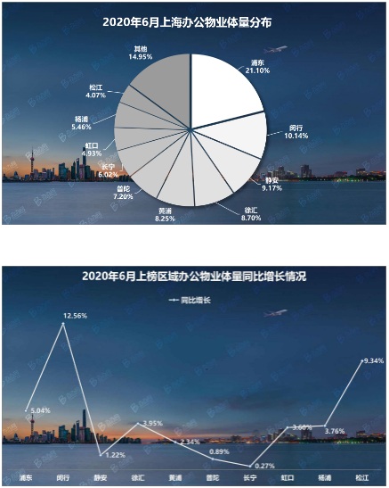 根據辦辦網大數據統計,上榜的10個區域內集中了全市85.05%的辦公物業體量,其中浦東的辦公物業總體量最多,占比高達21.10%,而閔行的辦公物業體量增長最快,同比去年6月增長12.56%。
