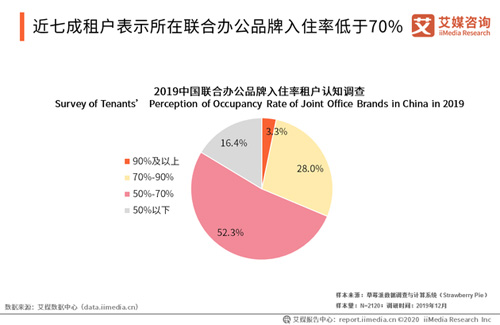 規(guī)模是起來了,但入住率非常關鍵。根據(jù)艾媒咨詢發(fā)布的國內(nèi)共享辦公數(shù)據(jù)顯示,僅有3.3%的租戶表示其所在的聯(lián)合辦公空間入住率達到了90%以上;68.7%的租戶認為其所在空間入住率不足70%。艾媒咨詢分析師認為,過去五年中,聯(lián)合辦公品牌在資本的助力下瘋狂跑馬圈地,雖然規(guī)模擴張快速,但整體運營能力相對滯后,失衡的發(fā)展速度導致行業(yè)整體入住率不高。