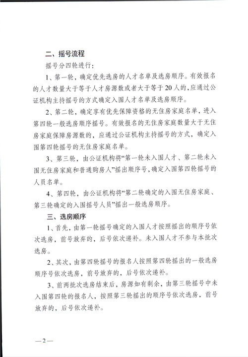 通知顯示,搖號分四輪進行。第一輪,確定優先選房的人才名單及選房順序。有效報名的人才數量大于等于人才房源數或者大于等于20人的,應通過公證機構主持搖號的方式確定入圍人才名單及選房順序。