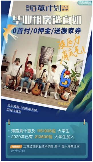 據了解,唐俊和他女朋友畢業后租的第一套房來自自如“海燕計劃”,該計劃是自如針對應屆畢業生推出的社會責任項目。主要特點包括“租金月付、0押金、送搬家券”等。