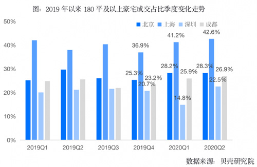 進(jìn)入二季度,疫情影響減弱疊加貨幣政策寬松影響,前期積壓的改善型需求集中釋放,重點(diǎn)城市豪宅市場強(qiáng)勢反彈,走出了V型曲線態(tài)勢。具體來看,二季度北京豪宅市場成交量同比增加55.6%,上海豪宅成交量同比增加63.5%,深圳豪宅成交量同比增加83.8%,成都豪宅成交量同比增加28.1%,北上深蓉二季度豪宅成交量均創(chuàng)下2018年以來季度新高。