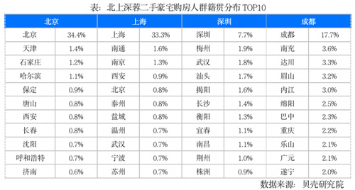 此外,從購房人群的籍貫統(tǒng)計看,豪宅購房人群多來自于本市及周邊縣市,但各城市又略有不同。深圳作為近年來外地人大舉遷入的城市,豪宅購房人群中本地人占比最低;而豪宅市場已發(fā)展多年且門檻較高的北京、上海,本地人占比最高;成都作為區(qū)域中心城市,吸引周邊縣市人群購房的占比遠(yuǎn)高于北上深。