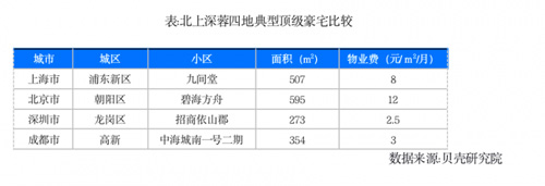 以北上深蓉四地的頂級豪宅為例,在居住品質(zhì)追求方面都很一致,就一個詞——享受。北京朝陽區(qū)碧海方舟小區(qū)的一套豪宅,595平方米的豪宅每個月物業(yè)費(fèi)12元/平方米,一年換算下來物業(yè)費(fèi)支出近8.57萬元。上海浦東新區(qū)九間堂小區(qū)一套507平方米現(xiàn)代中式園林大宅,小區(qū)綠化面積約66044平方米,還與世紀(jì)公園、高爾夫球場相臨,城市大隱生活之所在。