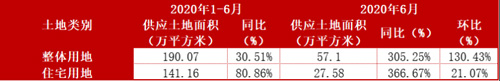 2020年1-6月,北京市共推出各類用地37宗,推出面積共計190.07萬平方米,同比增加30.51%。其中,推出住宅用地26宗,推出面積141.16萬平方米,同比增加80.86%。