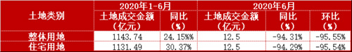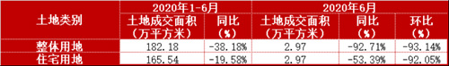 土地成交面積:6月份環比下降93.14%,僅成交一宗宅地