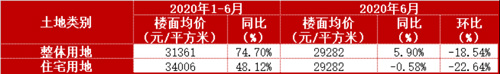 2020年上半年,北京供應了大量的不限價住宅用地,土地市場成交量減價升狀況明顯。2020年1-6月,北京市成交土地樓面均價為31361元/平方米,同比上升74.7%。6月份,北京市成交樓面均價為29282億元,同比上升5.9%,環比下降18.54%。