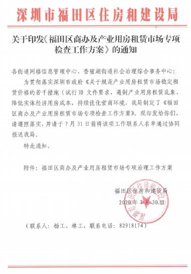 2020年7月30日,為遏制房屋租賃亂象、降低實體經(jīng)濟(jì)用房成本,持續(xù)優(yōu)化營商環(huán)境深圳市福田區(qū)住房和建設(shè)局發(fā)布《福田區(qū)商辦及產(chǎn)業(yè)用房租賃市場專項檢查工作方案》的通知。