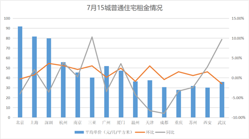 觀點指數重點監測租賃熱門的15個城市發現,7月15城平均住房租金均價為47.77元/平方米/月;整體租金較上月有小幅度回升,單月平均環比增速為0.91%。值得注意的是,本月15城住房租金均價環比下跌0.4%。