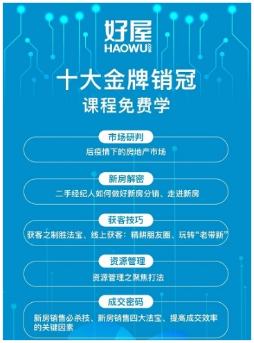 據悉,好屋“成長管家”首期推出十大金牌銷冠系列課程,課程內容涉及市場、獲客、銷售、成交等房產銷售各個環節內容,在幫助經紀人打通與C端客戶的溝通壁壘,強化專業能力、提高效率實現協同的同時,幫助他們更好地滿足客戶在大數據時代的更精準、更多元的房產服務需求。