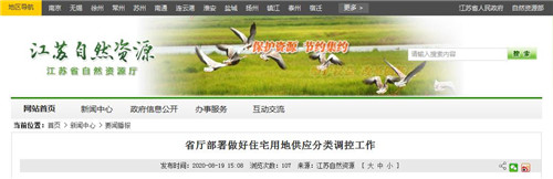 房訊網訊 8月19日,江蘇省自然資源廳發布《省廳部署做好住宅用地供應分類調控工作》,就做好2020年住宅用地供應分類調控工作進行部署。