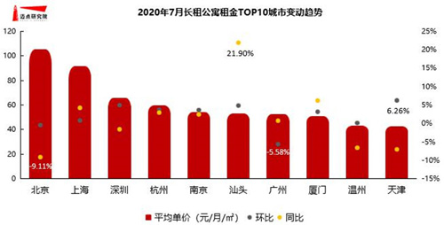 7月長租公寓(普通公寓)全國城市租金走勢整體呈上升趨勢,其中北京、上海、深圳、杭州和南京的月度租金分別為105.13元/月/㎡、91.36元/月/㎡、65.98元/月/㎡、59.57元/月/㎡和54.49元/月/㎡。環比中,天津42.66元/月/㎡增幅最大6.26%,同比中,汕頭53.07元/月/㎡增幅最大為21.90%,京津和大灣區仍然值得關注。
