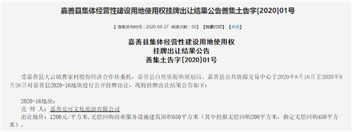 8月27日,浙江省嘉興市嘉善縣公共資源交易中心發布嘉善縣集體經營性建設用地使用權掛牌出讓結果公告,嘉善安可文化旅游有限公司于26日以1871.04萬元的價格將大云鎮曹家村一宗面積23.388畝(15592平方米)的集體經營性建設用地成功拿下。