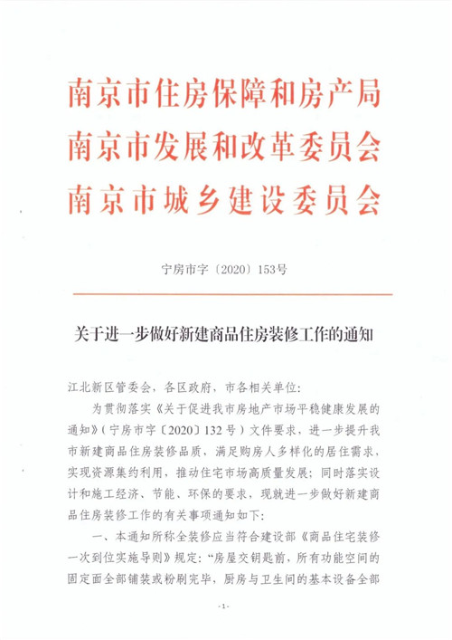 根據(jù)江蘇省南京市住房保障和房產(chǎn)局8月27日的消息,8月14日起,南京市已實施由南京市住房保障和房產(chǎn)局、南京市發(fā)展和改革委員會和南京市城鄉(xiāng)建設(shè)委員會聯(lián)合出臺的《關(guān)于進一步做好新建商品住房裝修工作的通知》。