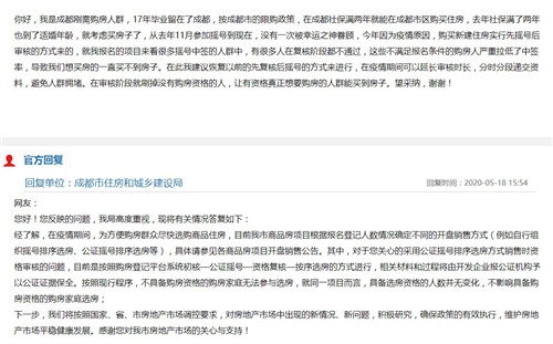 不過,此舉也引來不少成都市剛需客戶的質疑。網站“問政四川”平臺上,不少購房者指出,“今年因為疫情原因,購買新建住房實行先搖號后審核的方式來的,就我報名的項目來看很多搖號中簽的人群中,有很多人在復核階段都不通過,這些不滿足報名條件的購房人嚴重拉低了中簽率,導致我們想買房的一直買不到房子。”