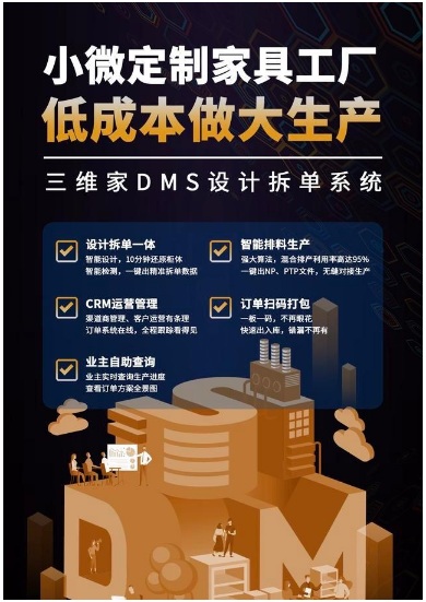 自2013年成立以來,三維家已逐步深入到家居產業的各個環節,強化大數據和人工智能在家居各場景的深化應用,并幫助超過1000家家居工廠完成前后端一體化布局。三維家為了深度賦能小微定制企業用戶,在產品矩陣上進行了縱向擴充,開發并推出了DMS設計拆單系統,解決設計、生產、管理全流程的難題。