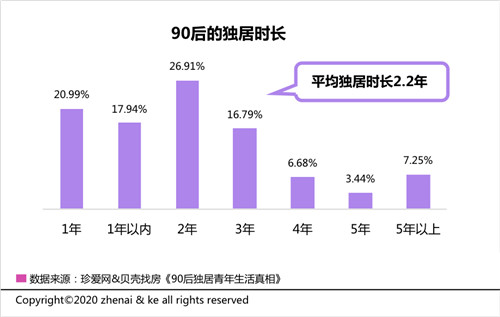 此次跨平臺調查收到了1200份有效問卷。結果顯示,90后中近八成曾有過獨居生活經歷(包括獨自居住、與陌生人合租零溝通式隱形獨居)。從獨居時長看,90后青年平均獨居時長為2.2年,其中獨自一人生活3年及以上的比例達到34.16%。