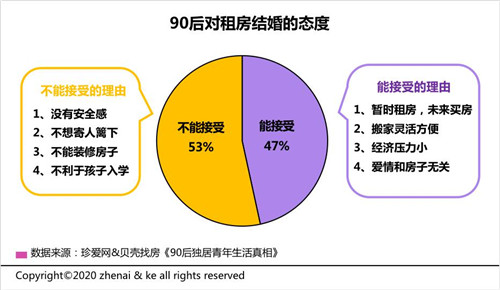 談及結婚,調查顯示,在90后獨居青年中,“接受租房結婚”和“不接受租房結婚”幾乎各占一半,過半數90后拒絕“租房結婚”,其中缺乏安全感是首要原因。