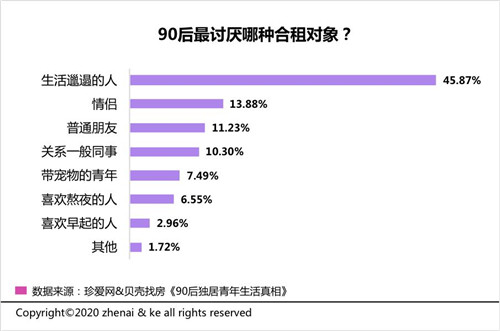 合租對象選擇方面,90后青年群體傾向與熟悉的朋友或同事共同租房,最不能接受與生活習慣邋遢的人一起合租,占比達45.87%,其次是不愿意和情侶合租。