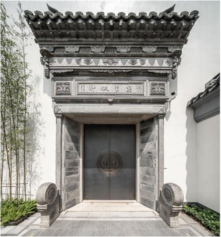 鋪首的造型在古代多種多樣,多以金屬冶制成獸首狀作為底座,安裝在大門上用以銜門環。環則作為主要的受力構件,用來開關大門或扣門,集合實用性和裝飾性于一體。福州建發·央璽售樓處會所是一棟四百年古建筑,大門鋪陳豐富的卷云形花邊,椒圖為原型的鋪首,威嚴而精美,與央璽古典主義氣質相得益彰。